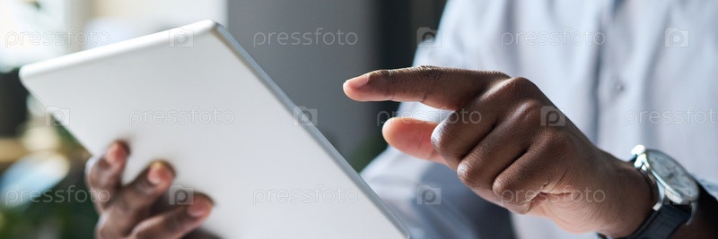 Руки человека, использующего цифровой планшет на работе Header