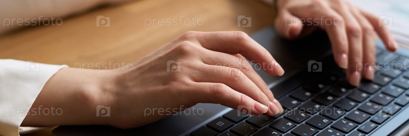 Руки неузнаваемой женщины, печатающей на ноутбуке на работе Header