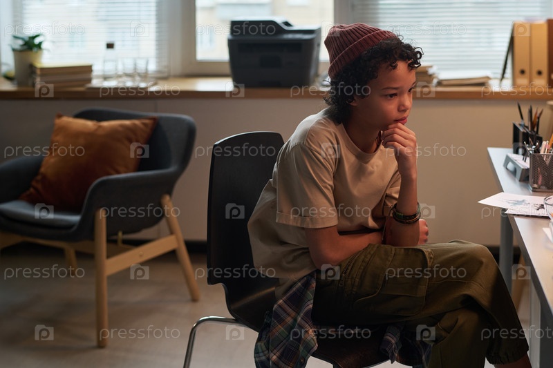 Милый расстроенный школьник посещает консультанта
