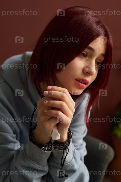 Раздраженная девочка-подросток в голубой толстовке с капюшоном