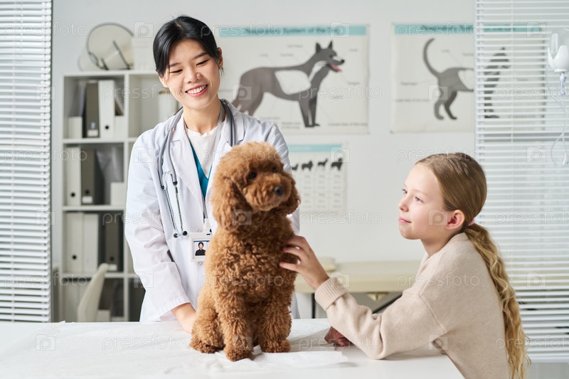 Маленькая девочка обнимает милую пушистую собаку в ветеринарной клинике
