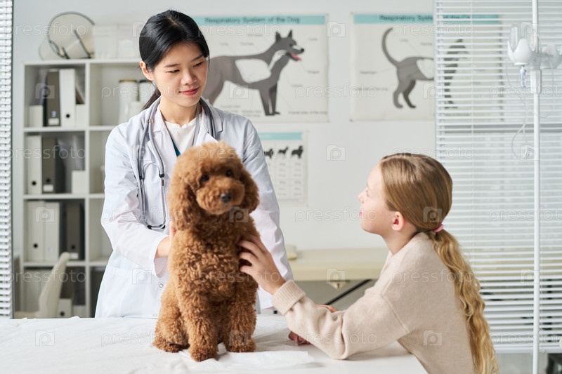 Ветеринар и девушка обсуждают собак результаты осмотра