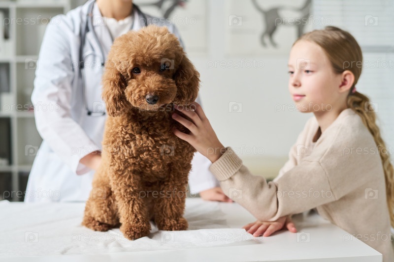 Маленькая девочка ласкает милую пушистую собаку во время визита в клинику