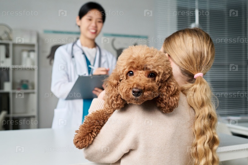 Маленькая девочка приносит собаку к ветеринару