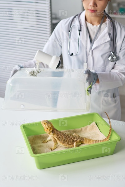 Молодой ветеринар открывает зоотранспортер с ящерицей