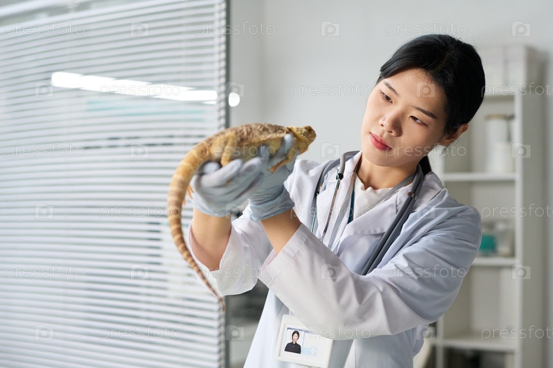 Ветеринар смотрит ближе на ящерицу во время осмотра