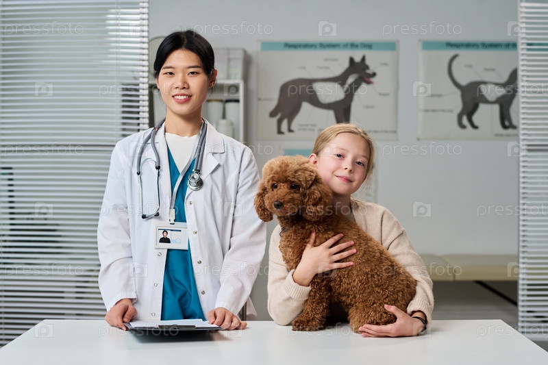 Ветеринар и владелец маленькой собаки смотрят на камеру