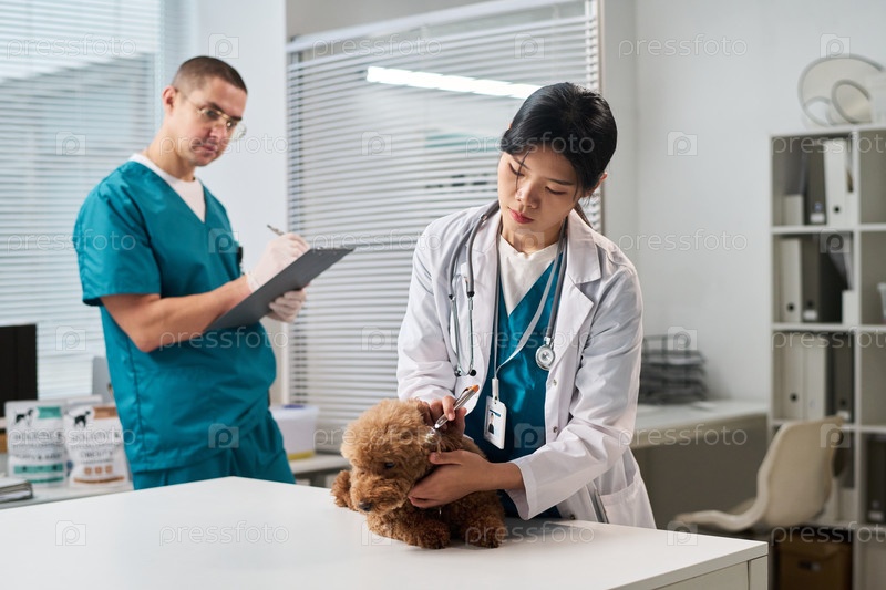 Два коллеги осматривают собаку в ветеринарной клинике