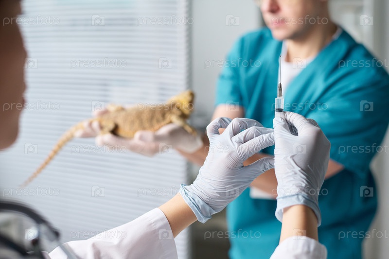 Руки ветеринара, держащего шприц с вакциной для ящерицы