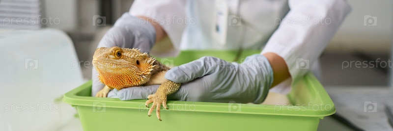 Непризнанный ветеринар пальпирующий ящерицу во время проверки