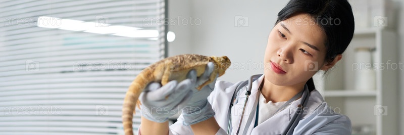 Ветеринар смотрит ближе на ящерицу во время проверки