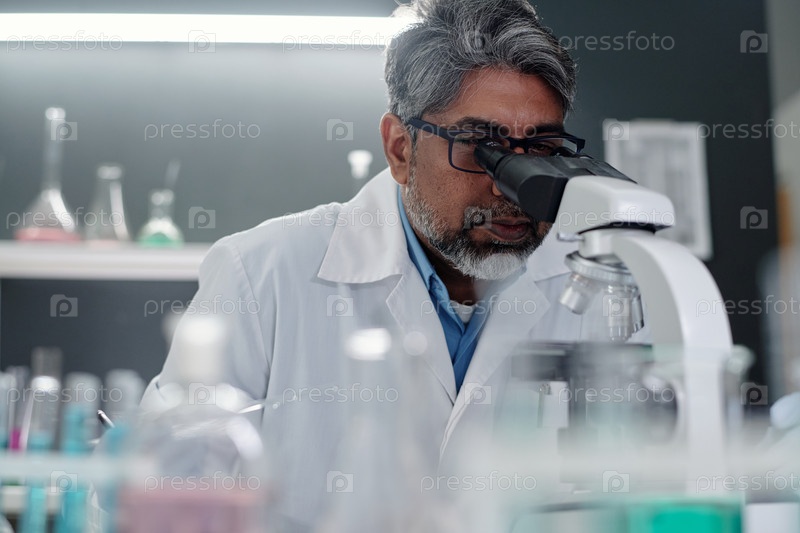Ученый, изучающий образцы под микроскопом в лаборатории