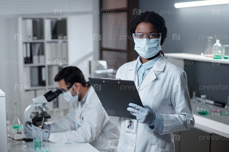 Портрет чернокожей женщины-учёного, держащей клипборд в лаборатории