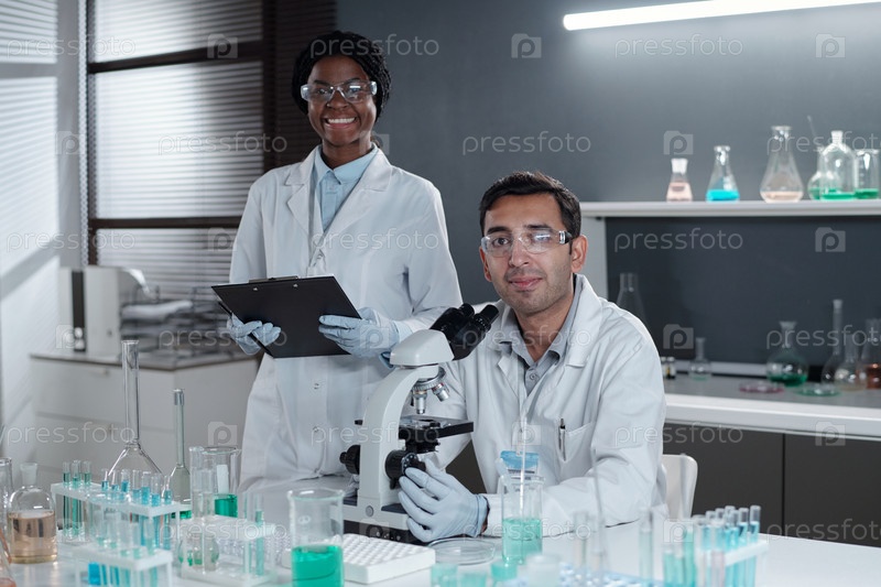 Улыбающиеся ученые работают в современной лабораторной обстановке