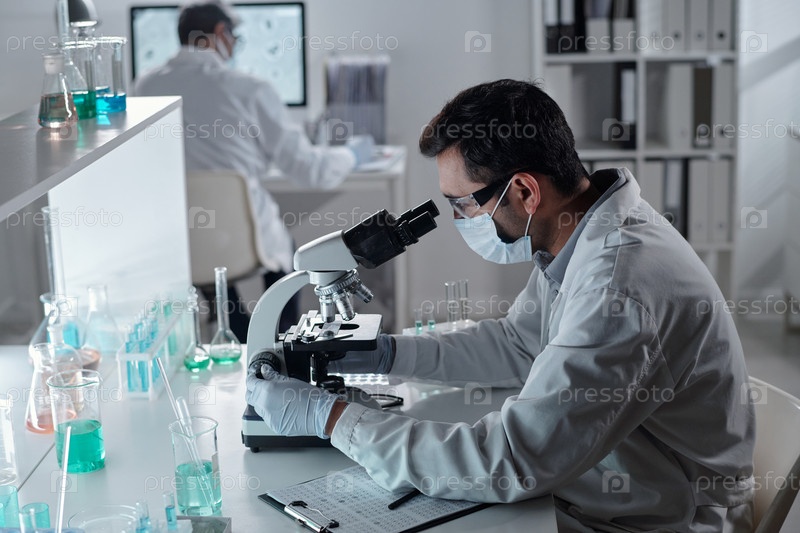 Ученый, анализирующий образец с помощью микроскопа в лабораторной обстановке