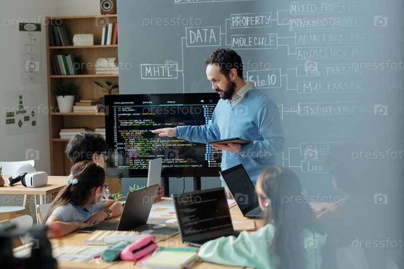 Учитель объясняет концепции кодирования в классной обстановке учитель