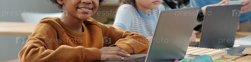 Улыбающийся ребенок использует ноутбук для обучения в классе