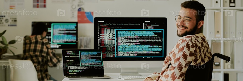 Заголовок с улыбающейся программисткой на работе
