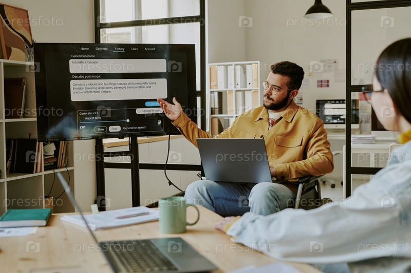 Руководитель команды дает презентацию в офисе Мужчина