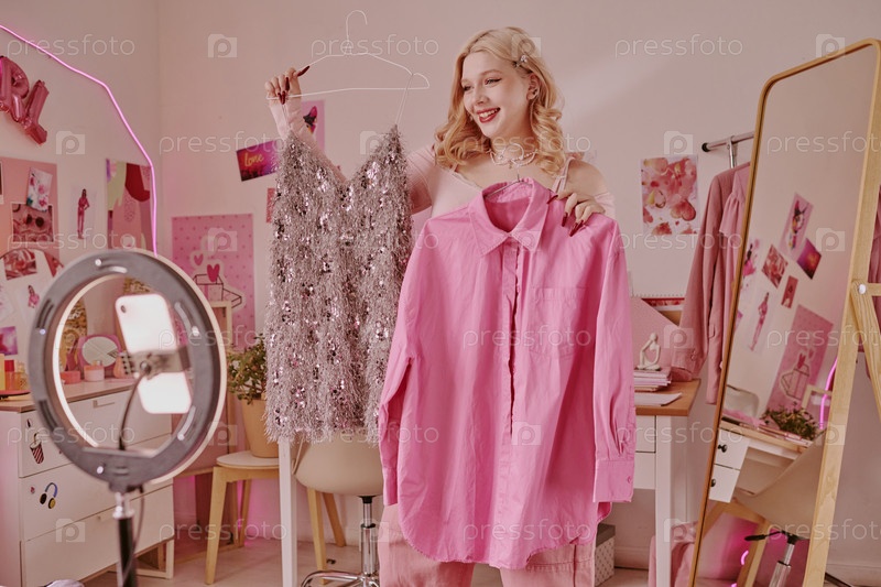 Подросток с новой одеждой на вешалки в руках Content Teenager with New Clothes on Hangers in Hands