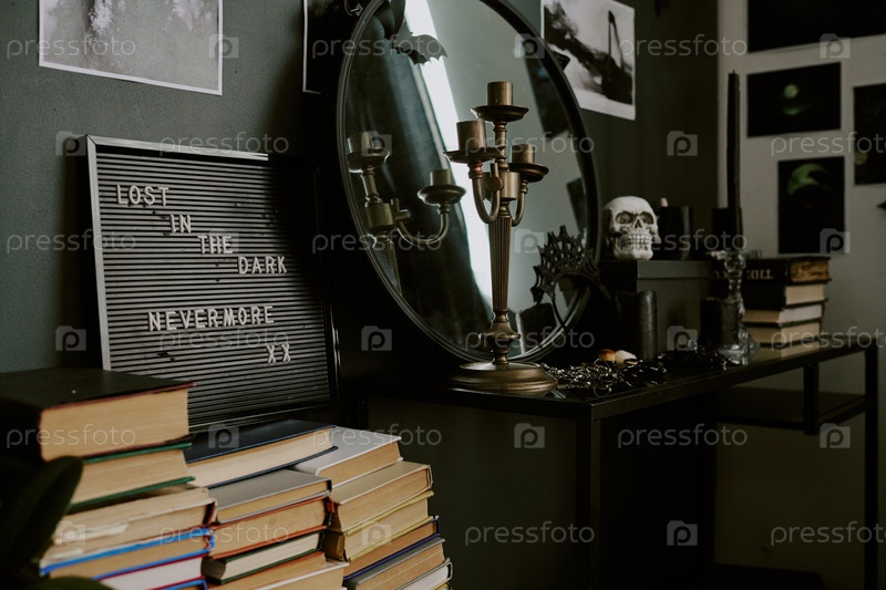 Stacked Books near Vintage Dressing Table Накопленные книги рядом с Винтажным раздевалкой