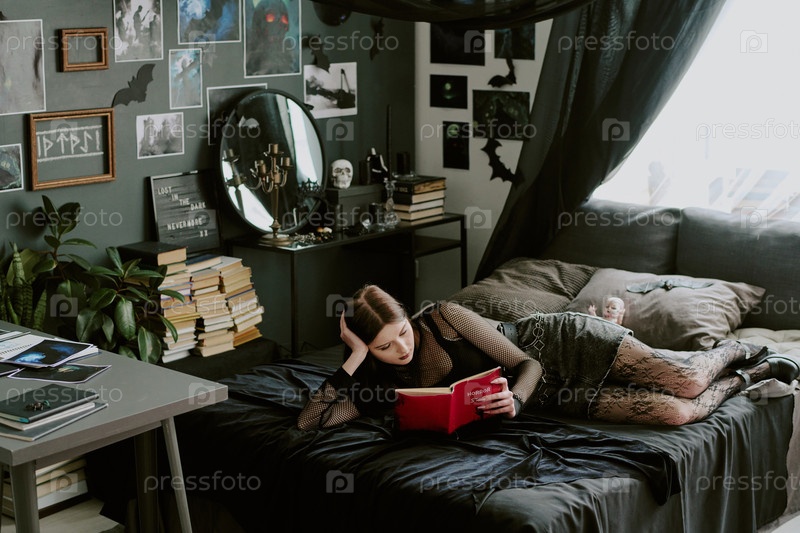 Девушка проводит день в своей готической спальне