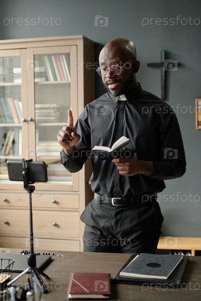 Серьезный мужчина, имеющий онлайн-церковную службу