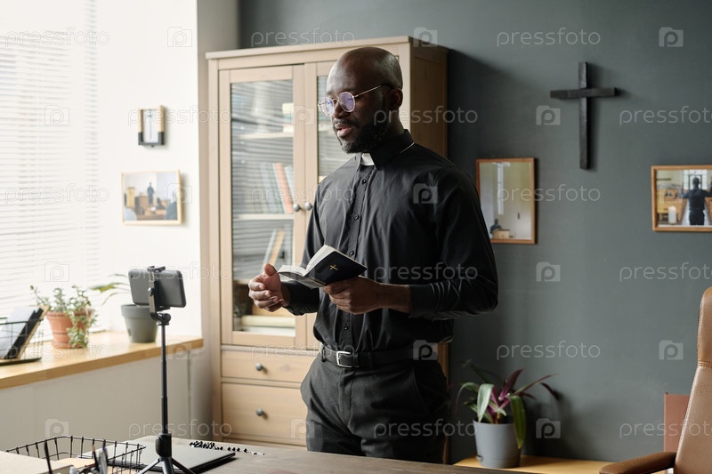 Пастор, стоящий перед смартфоном на штативе