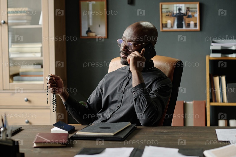 Мужчина разговаривает со своим смартфоном, работая в офисе