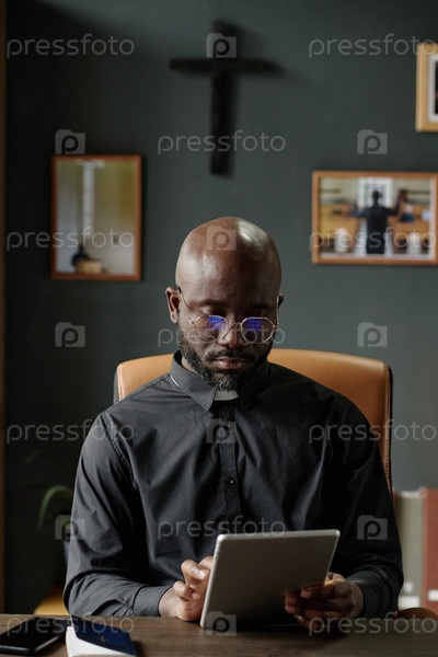 Пастор с планшетом в руках сидит в офисе