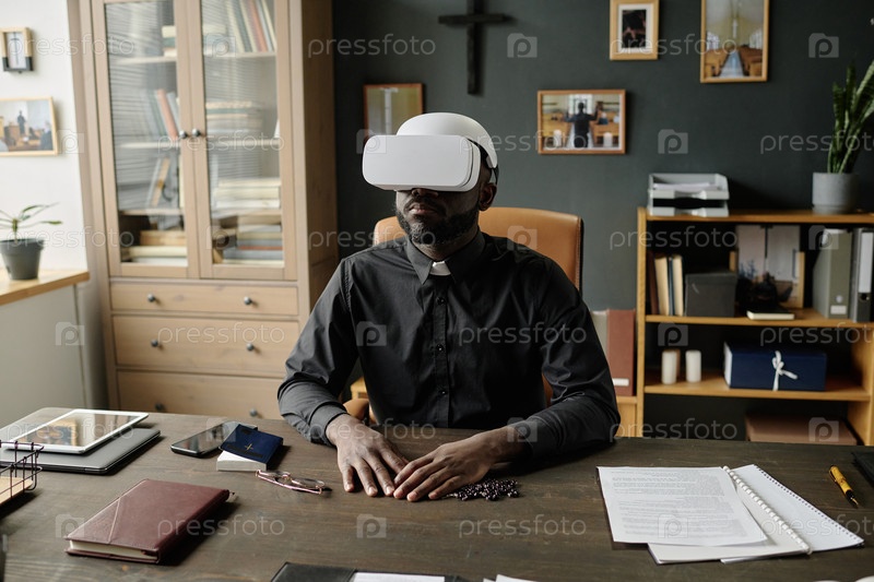 Священник тестирует VR-гарнитуру во время перерыва