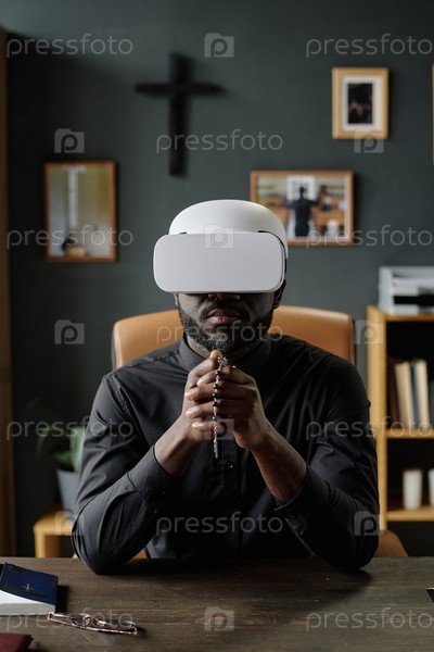 Священник с VR-очками и розарием в руке