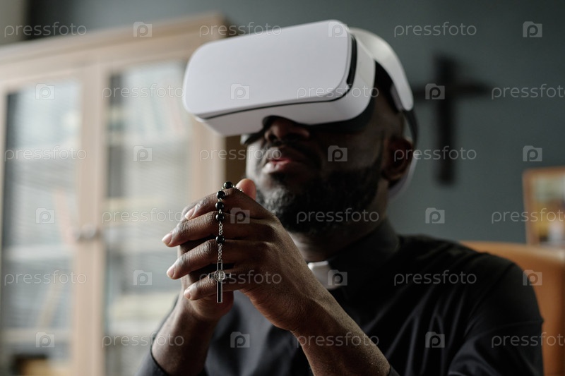 Священник с VR-установкой на голове в офисе