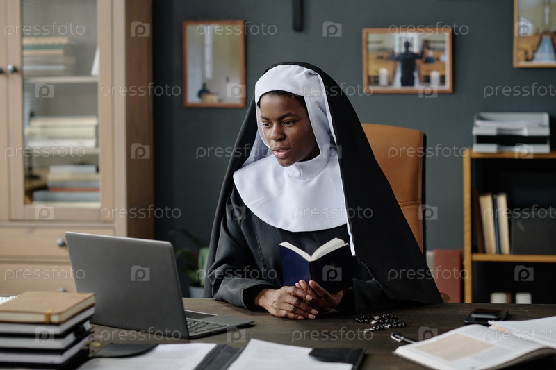 Монахиня, проводящая видеозвонки в офисе