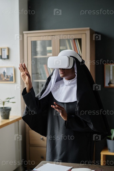 Монахиня жестикулирует, играя в VR-игру