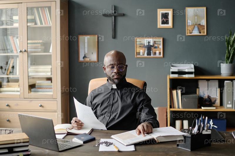 Пастор сосредоточен на документах в офисе