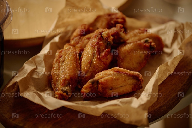 Ближайшее изображение жареных куриных крыльев, подаваемых на коричневой бумаге