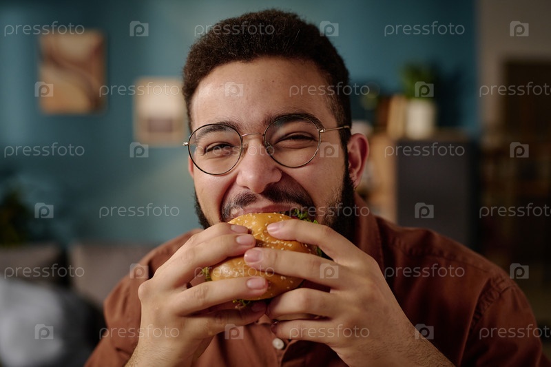 Портрет человека, наслаждающегося вкусным бургером в помещении