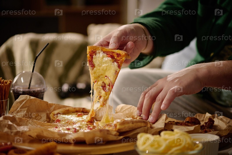 Человек, наслаждающийся сырой пиццей с различными закусками