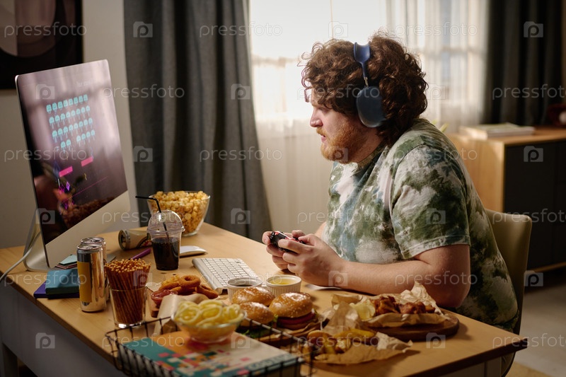 Игровой энтузиаст сидит за столом с несколькими закусками