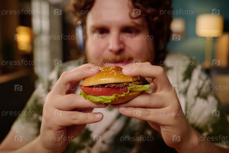 Мужчина держит вкусный гамбургер обеими руками