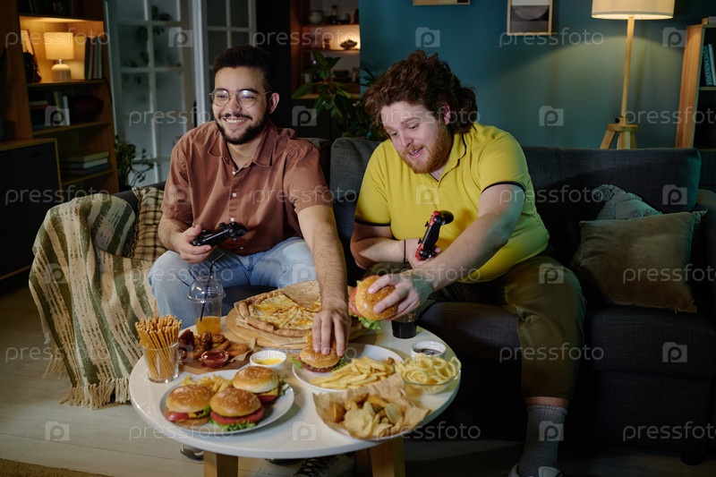 Друзья играют в видеоигры, едят гамбургеры и закуски
