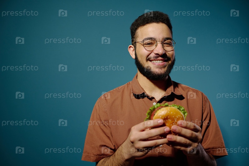 Улыбающийся мужчина держит бургер с очками на синем фоне