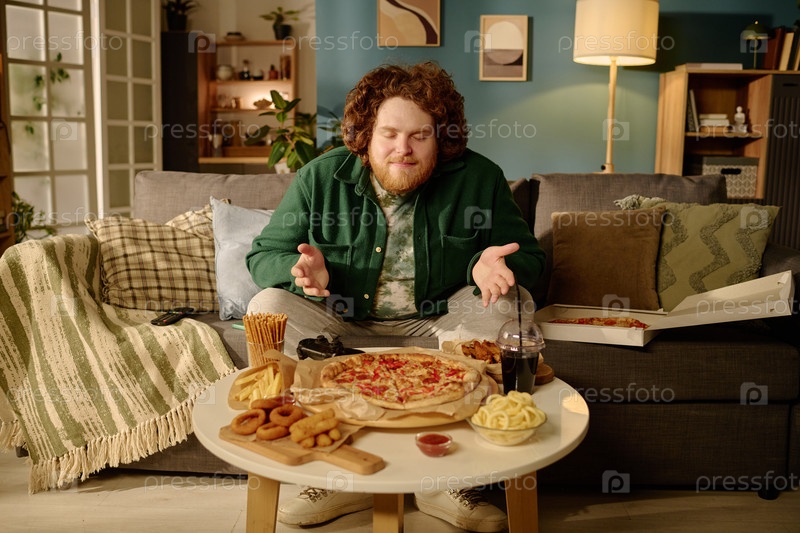 Человек наслаждается пиццей и закусками в уютной гостиной