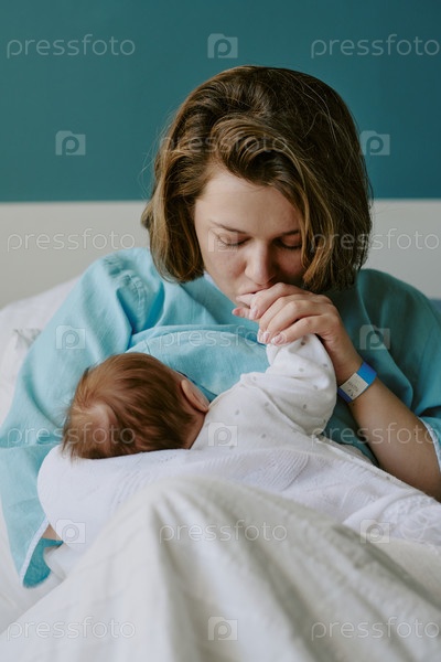 Мать целует младенца, держа его в постели с голубым одеялом