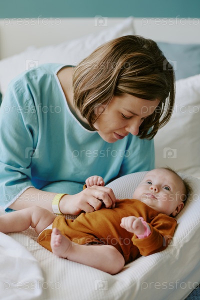 Мягко обнимающий младенца в уютной домашней обстановке мама