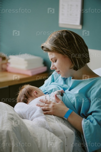 Заботливая мать нежно держит новорожденного ребенка в больничной комнате