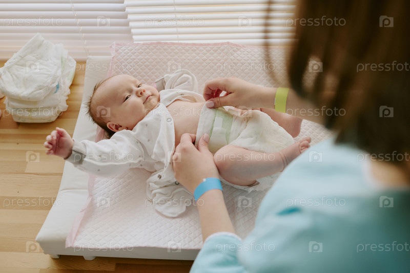 Ребенок-мальчик, которому надевают подгузники на переодевательном столе