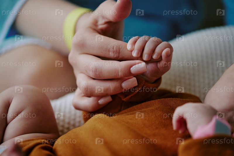 Держась за руки с новорожденным, показывая любящую связь