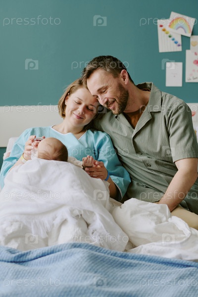 Любящие родители обнимают новорожденного в больничной комнате
